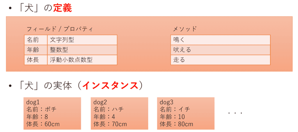 フィールドやメソッドは、クラスの定義に含まれるべきものです。クラスの定義に対し、その定義をもとに作成された実体をインスタンスと呼びます。